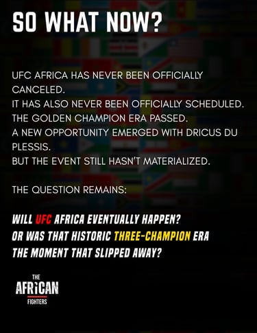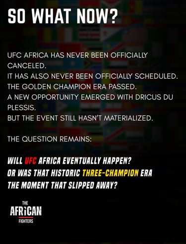 The golden championship era that once made the event feel imminent has passed, but the opportunity itself remains. As new African contenders rise and commercial partnerships evolve, the long-anticipated debut of UFC Africa remains less a question of possibility and more a question of timing.
